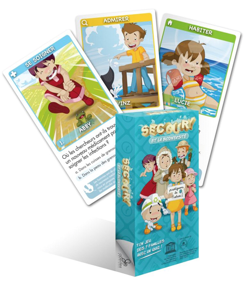 Jeu des 7 familles avec quiz pour enfants sur la biodiversité. Les 7 familles sont : se souvenir, habiter, protéger, admir...